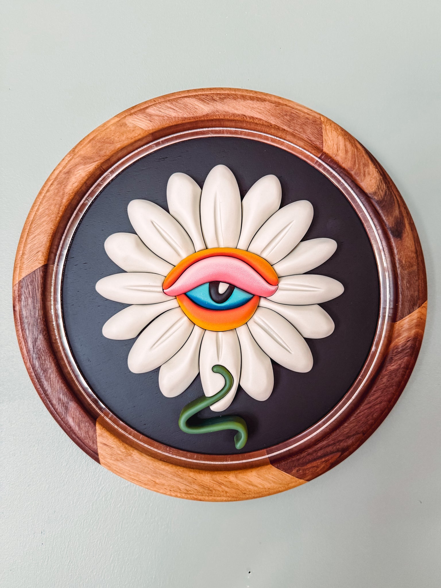 A hand-carved daisy with a single eye at its center, framed in walnut with a mirrored acrylic border.