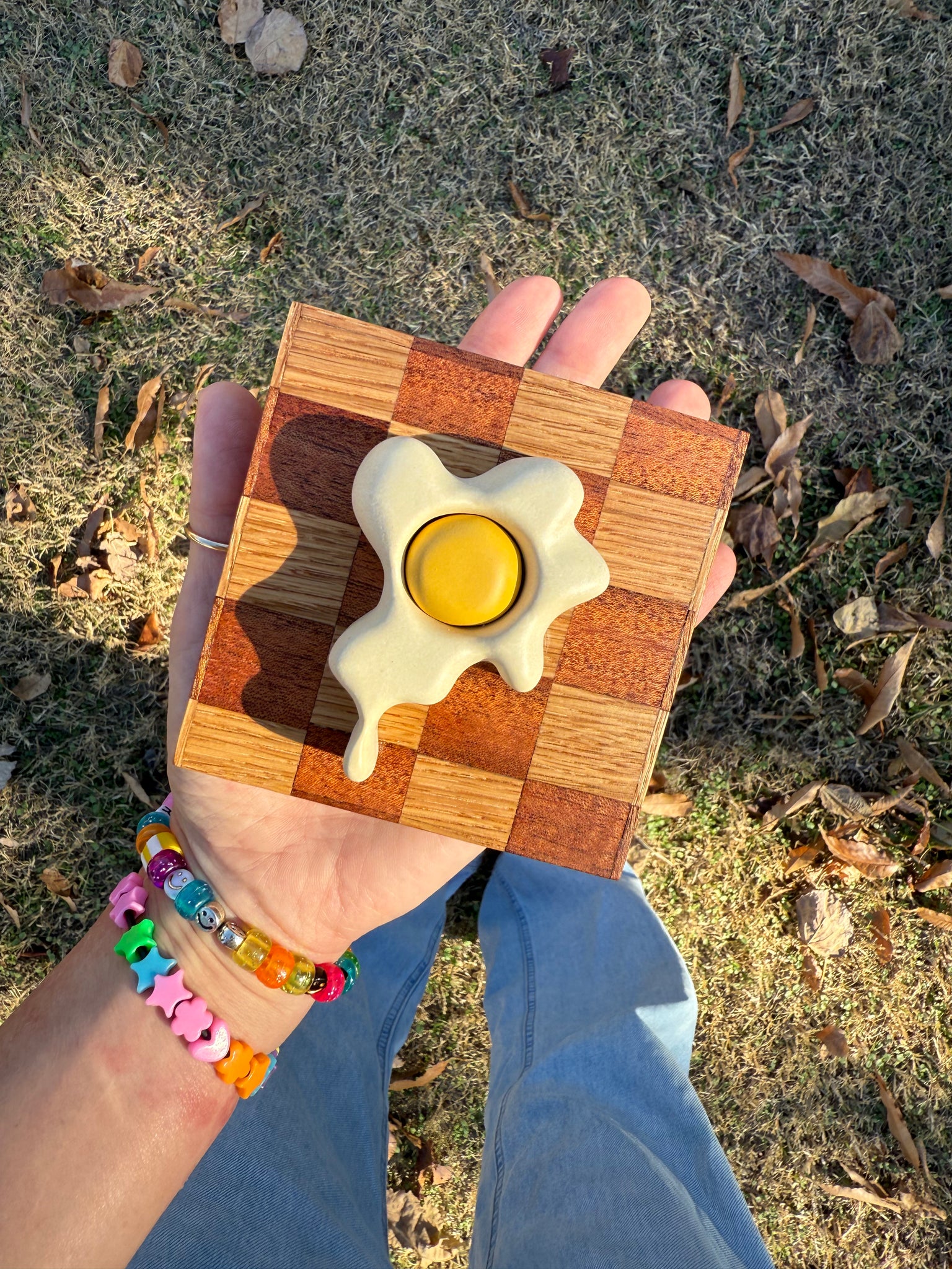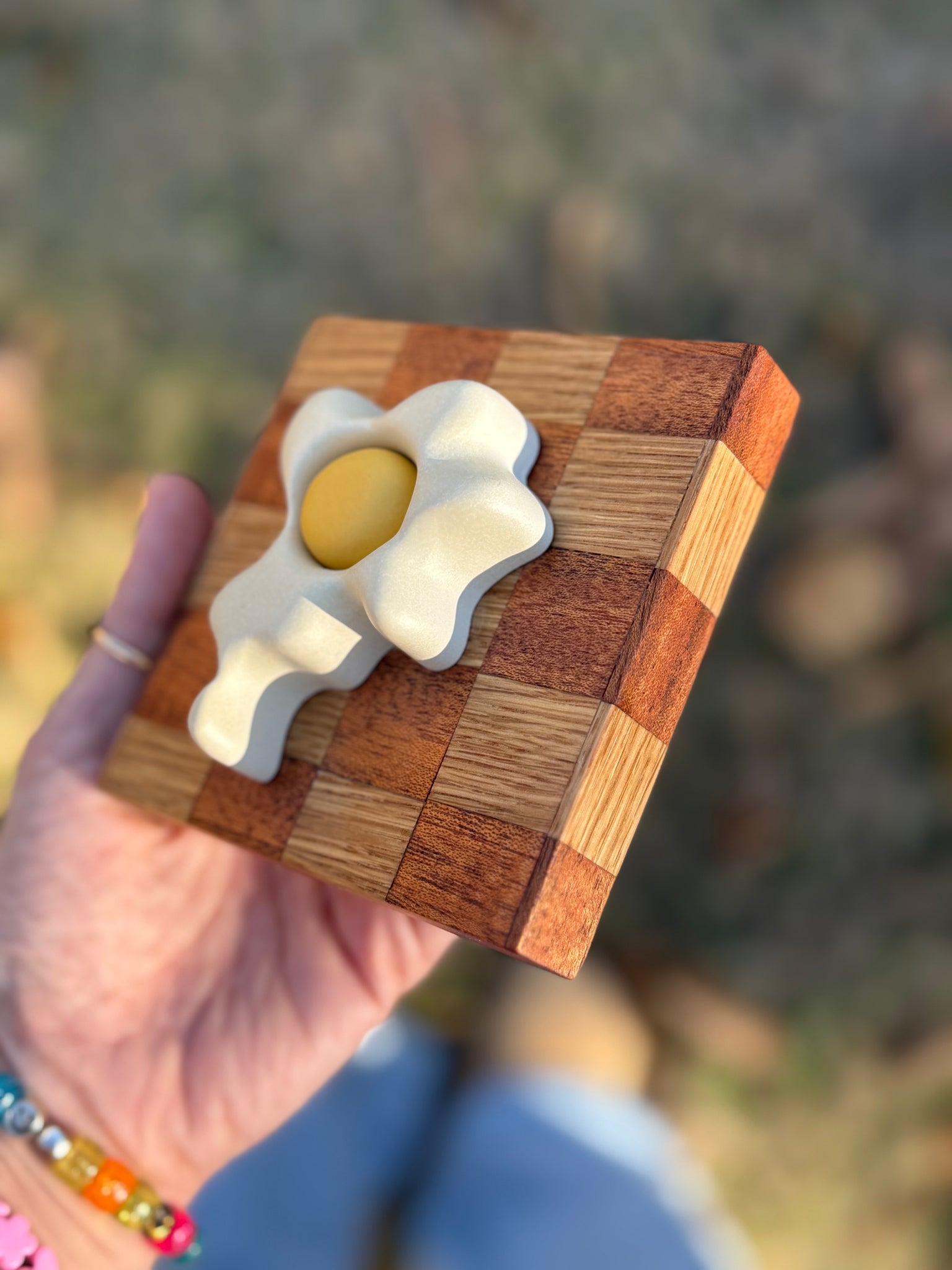 A small piece featuring a sunny-side-up egg set into a checkerboard hardwood background. The warm wood tones contrast with the smooth, sculpted egg for a simple, playful look. It’s a compact accent that adds a bit of humor to your space.
